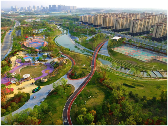 兰溪公园分A、B、C、D四个板块,从北到南依次是A区是生态教育、B区创意运动、C区艺术休闲、D区都会文化。兰溪公园的一大特色亮点是打造城市绿道,绿道宽为4—6米,全长约7公里,沿着兰溪河依河而建,路面材质采用透水彩色沥青,与海绵城市融为一体,使雨水及时渗透排出;另一大特色亮点是引入海绵公园的概念,采用渗、滞、蓄、净、用、排等措施,构筑水系安全,提升城市防洪排涝综合能力,有力保障了高新区建设“水安全、水生态、水环境、水资源”四位一体的海绵综合体。