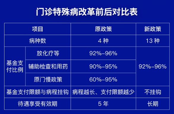门特病种由原来的4种:恶性肿瘤、慢性肾功能衰竭透析治疗、器官移植术后抗排异治疗(含造血干细胞)、血友病,增加到13种:恶性肿瘤、慢性肾功能衰竭透析治疗、器官移植术后抗排异治疗(含造血干细胞)、血友病、再生障碍性贫血、系统性红斑狼疮、颅内良性肿瘤、骨髓纤维化、运动神经元病、慢性肾功能衰竭非透析治疗、肺结核、严重精神障碍、艾滋病。
