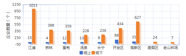 4. 板块特色明显。分板块看,江浦街道数字经济核心产业企业数最多,在全区占比近三成;高新区有416家数字技术应用业企业,共创增加值13.8亿元,占高新区数字经济核心产业增加值超九成;开发区有213家数字产品制造业企业,共创增加值111.2亿元,占开发区数字经济核心产业增加值的99%;桥林街道、汤泉街道、星甸街道、永宁街道产业分布多样,涉及门类广泛;珍珠泉度假区仅有数字技术应用业与数字要素驱动业企业;老山林场仅有数字技术应用业企业。