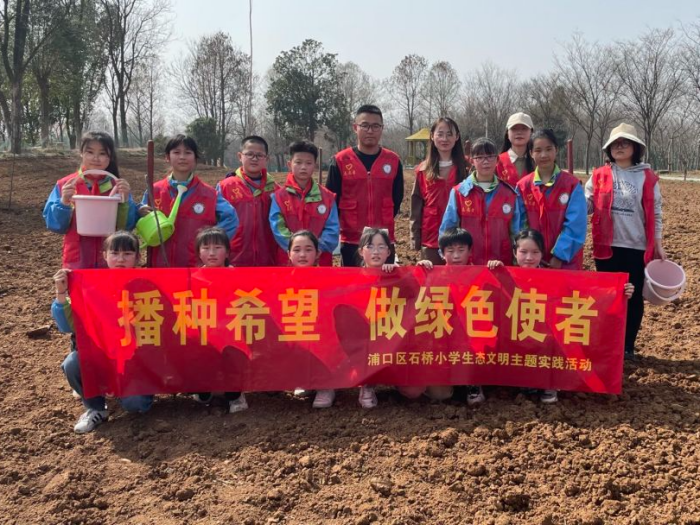浦口区石桥小学联合星甸高庙社区组织青年团员教师、少先队员在万成生态园开展“播种希望 做绿色使者”生态文明教育实践活动,用实际行动绿化美好家园,在学生心田播下生态文明的种子。