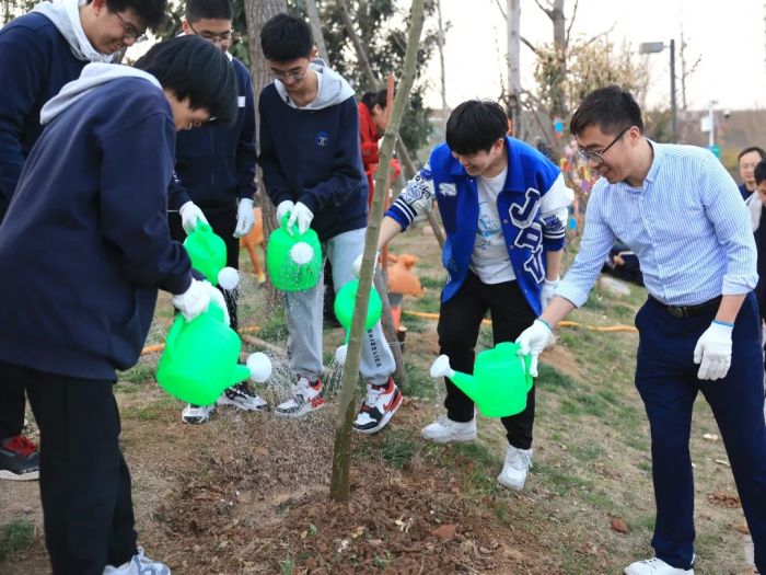 南京汉开书院学校开设2023“种下一棵理想树”的特色活动课。上午,2022级师生一同选址、栽种年级树和班级树、培土、浇水、系上红丝带,下午,仪式上,各级部师生代表在理想树下畅聊理想。